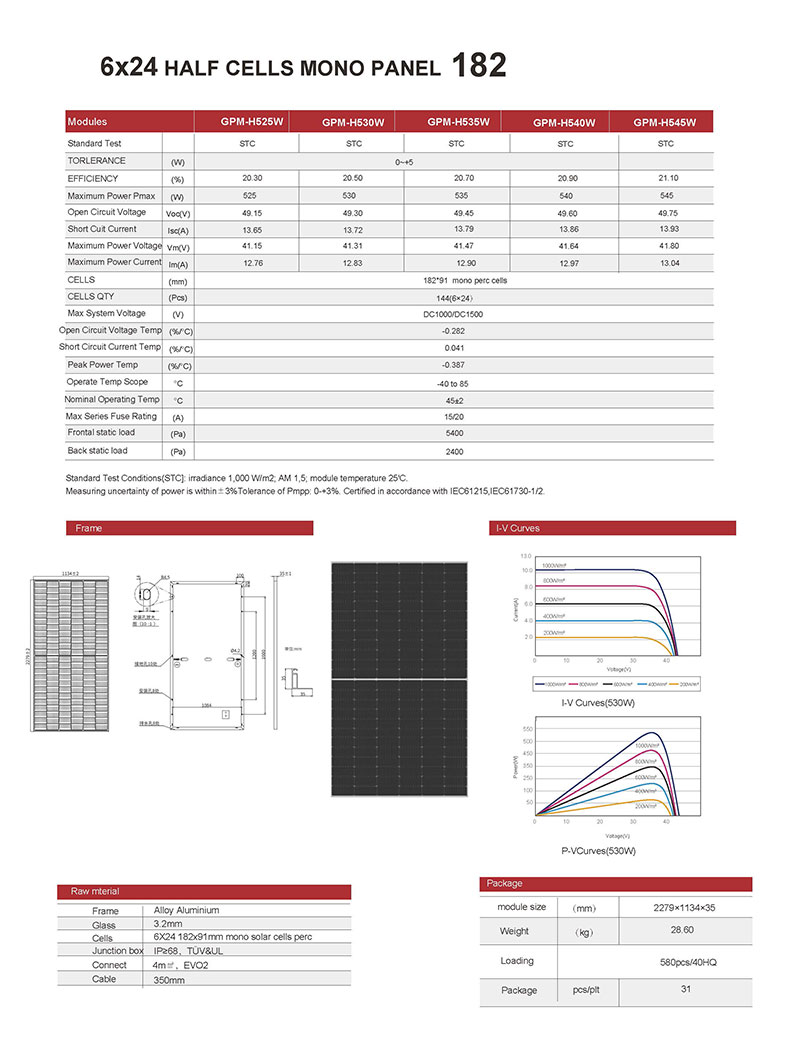Panneaux Solaires Mono 182mm Demi-Cellules-144 Cellules 525W
